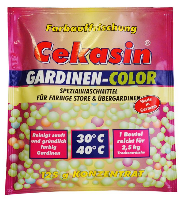 Spezialwaschmittel für Farbige Store und Übergardinen; Waschtemperatur 30 Grad bis 40 Grad Celsius; 1 Beutel reicht für 2,5 kg Trockenwäsche; Inhalt: 125g.