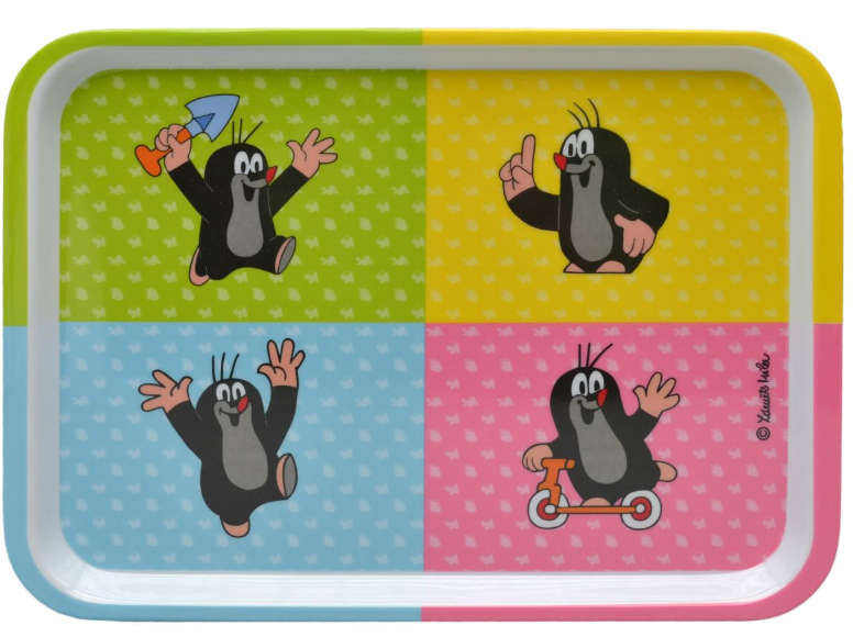 Ein Tablett aus Plastik mit 4 verschiedenen Maulwurfmotiven mit den Maßen 28 x 20 cm.